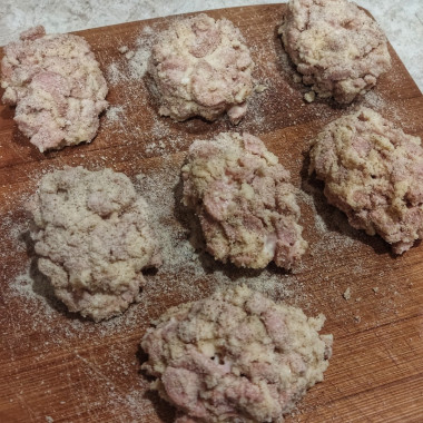 5. Сухари заранее насыпаем на плоское блюдо. Руки смачиваем водой и формируем из получившегося фарша котлетки. Обваливаем каждую котлетку со всех сторон в сухарях, заготовки пока выкладываем на разделочной доске.
