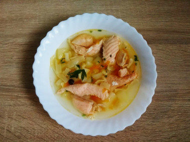 Для приготовления супа из горбуши замороженной, использовала замороженную обрезь (небольшие кусочки разных частей рыбы), поэтому этап варки головы и хвоста пропустила. Для большей густоты и сытности добавила в суп горсть домашней лапши (оказалось всё хорошо сочетаемо