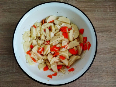 Овощи положите в глубокую миску, посолите, посыпьте выбранными приправами. Полейте их растительным маслом и хорошо перемешайте.