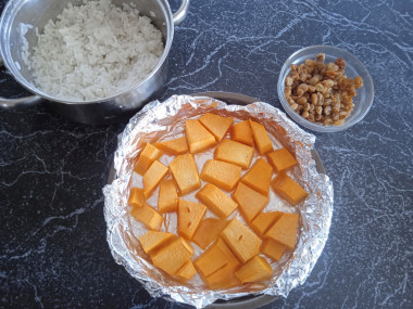 Пока печется тыква, отварите рис. Для этого несколько раз промойте. Залейте рис водой в кастрюльке и отварите до готовности. Время и количество воды будут зависеть от сорта риса. Ориентируйтесь по инструкции на упаковке. Подробнее о различных сортах риса читайте в конце рецепта. Промойте изюм, затем залейте его теплой водой примерно на полчаса. После воду слейте, а изюм еще раз промойте и обсушите бумажными полотенцами.