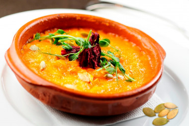 Форму затяните сверху слоем фольги. Поставьте форму в разогретую до 180 градусов духовку примерно на 10 минут. Точное время будет зависеть от особенностей вашей духовки. Узнать об особенностях работы духовок можно, прочитав отдельную статью, ссылка в конце рецепта. Выньте кашу из духовки, снимите фольгу, украсьте кашу тыквенными семечками, зеленью, орешками, ягодами, кусочками фруктов и т. д. Можно полить кашу тыквенным маслом Приятного аппетита!