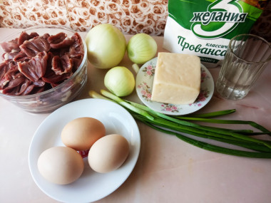 Калорийность продуктов: Куриные сердечки, Твёрдый сыр, Яйца, Зелёный лук, Лук репчатый, Уксус, Майонез