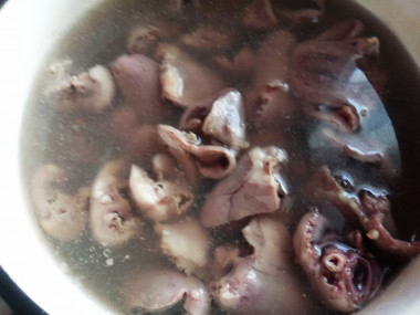 Первым делом ставим вариться куриные сердечки. Для этого отправляем их в кипящую подсоленную воду на 30 минут. Много соли не нужно, лишь бы только сердечки не получились совсем пресными. Готовые сердечки вынимаем из кастрюли, даем остыть и нарезаем вдоль крупные на 4 части, а мелкие на две. Торчащие хвостики-сосудики можно также срезать, чтобы салат имел более презентабельный вид, но можно и оставить, если готовите для себя.