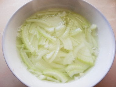 Лук очищаем, нарезаем четвертькольцами и замачиваем в кипятке на 15 минут в небольшой емкости. После этого воду сливаем и тут же заливаем лук на 15 минут маринадом: 30 грамм столового уксуса на 1 стакан холодной воды. Все сливаем.