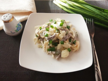 Все подготовленные для салата продукты (куриные сердечки, яйца, сыр, белый и зеленый лук) пересыпаем в глубокую миску, в которой будет удобно замешивать салат. Добавляем майонез и хорошо перемешиваем. Майонез лучше брать хорошей жирность - от 50%. Количество заправки регулируйте по своему вкусу. Если салат получается суховатый, то добавьте майонеза, но только не переборщите, чтобы не испортить и не забить вкус.