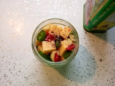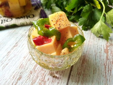 На просторах сайта встретила рецепт маринованного сыра. И таким он мне красивым и аппетитным показался на фото, что решила повторить. Тем более у меня в холодильнике лежал кусок твёрдого сыра с не выразительным вкусом. Банку взяла пол литровую, как раз все кубики в неё поместились. Сыр резала на кусочки со стороной примерно в 1,5 см. Стручок зелёного острого перца нарезала на колечки, а красный маленькими кусочками, чеснок пластинками. Трав у меня не было и в сушеном виде не нашла. Зато у меня есть смесь перцев, семян горчицы и паприки в мельничке. Всю эту красоту уложила в банку и залила оливковым маслом. Настаивался сыр три дня. За это время стал очень ароматным и в меру острым. Выглядит ярко и красиво! Его можно в салаты добавлять и просто так есть. Единственный минус - жирновато для меня, но мужу понравилось, это же оливковое масло)). Как только закончится сыр, буду заправлять овощные салаты ароматным маслом.