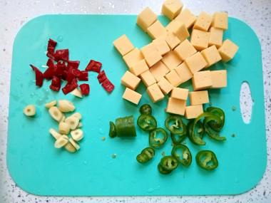 Перец чили вымойте, обсушите и нарежьте кружочками. Чтобы сыр получился не слишком острым, семена по желанию можно удалить. Я использовала два вида перца чили - зеленый и красный. Чеснок очистите и нарежьте лепестками.