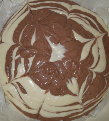 Возьмите форму для выпечки. У меня разъемная, диаметром 20 см. Получился торт идеальный по высоте. В более широкой форме торт получится низким. Смажьте бока формы растительным маслом, дно выстелите пергаментом. Начните по столовой ложке выкладывать тесто в центр формы. Ложка светлого теста, затем ложка коричневого в центр светлого и так далее.
