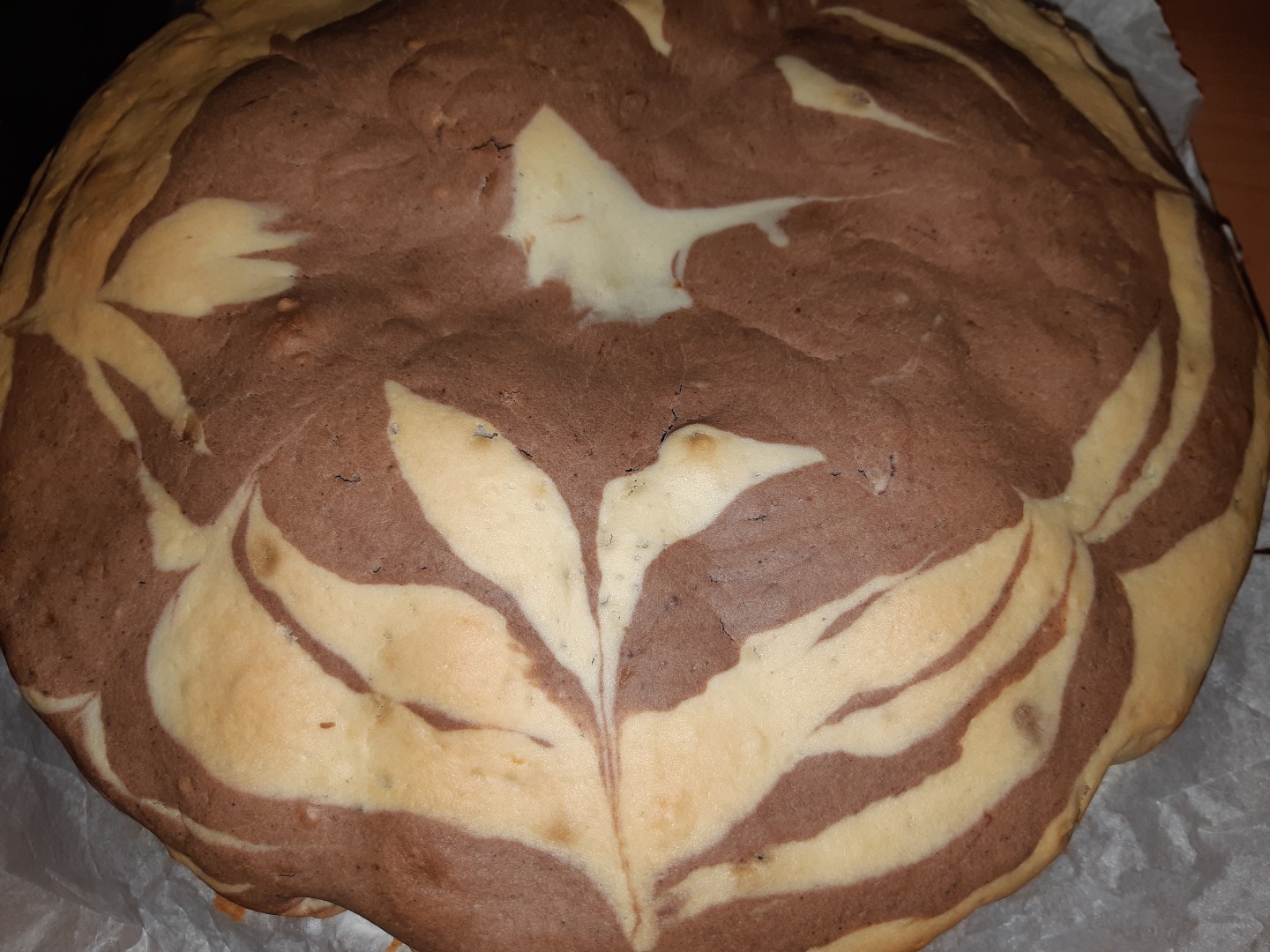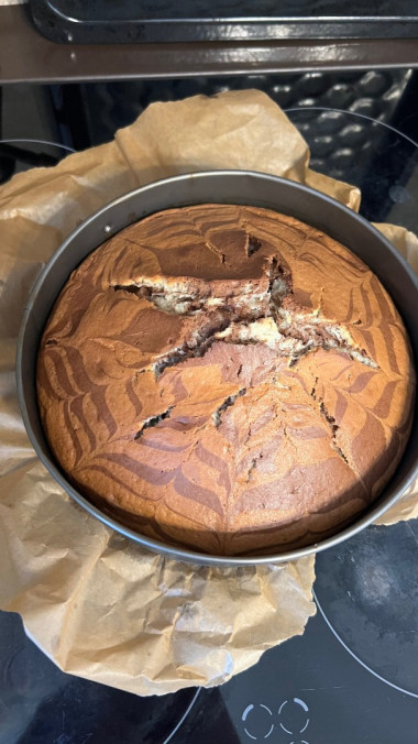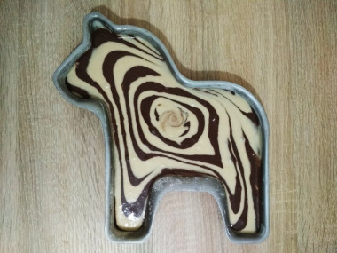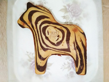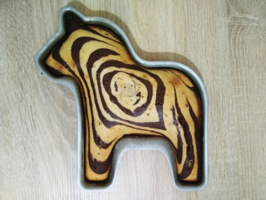 Может быть, зебра торт классический и советского времени, но я о нем узнала не так давно. Очень понравился этот рецепт. Правда, вместо нормальной сметаны я слила остатки всей молочки, которая оставалась в холодильнике, в одну ёмкость (там и ложка кефира, и классический йогурт, и жирные загустевшие сливки, и даже остатки крема) и хорошо перемешала, получилась такая густая молочная масса, похожая на жирную сметану. Но это никак не испортило этот замечательный кекс. Размер моей формы от холки до копыт 25 см и от хвоста до подбородка 22 см, но она с низкими бортиками, поэтому я отмерила лишь половину указанных в рецепте ингредиентов (думаю, надо было 3/4). Из общего количества муки я отложила немного (столько же, сколько какао), а после того, как разделила тесто на две равные части, в одну добавила какао, а в другую - эту отложенную муку. Таким образом обе части теста получились одинаковые по консистенции. Форму поместила в плохо разогретую духовку, впекала при 175 градусов (верх-низ с конвекцией), выпечка почти не растрескалась, рисунок на лошадке сохранился правдоподобным. Получилось очень здорово! Не просто вкусно и красиво, но ещё и весело! Спасибо автору за удачный рецепт "зебра торт классический советского времени" и приятные эмоции, связанные с процессом приготовления и поедания нашей зебры!