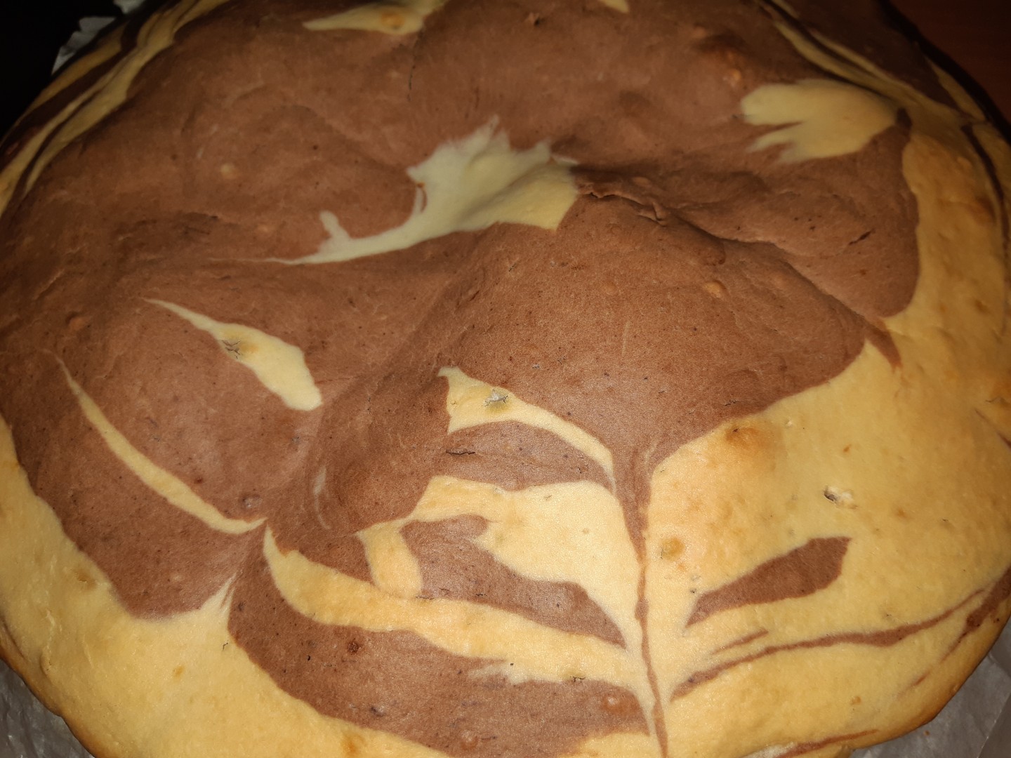 Разделите тесто на две равные части, отлив часть в другую миску. Добавьте в одну из них какао. Перемешайте.