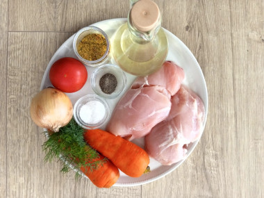 Как сделать куриную грудку с морковью и луком на сковороде? Подготовьте ингредиенты. Мясо лучше возьмите охлажденное, тогда оно получится более сочным. Если же грудка была заморожена, то предварительно разморозьте ее по всем правилам. Набор специй вы можете менять по своему вкусу или наличию.