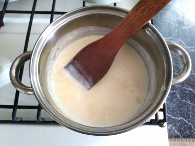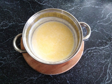 Когда каша снова закипит, вливаем оставшееся молоко, перемешиваем. Даем каше закипеть, не забывая помешивать. Выключаем огонь. Перемешиваем кашу. Она по консистенции должна быть жидковатой. Кладем в кастрюлю с кукурузной кашей кусочек сливочного масла. Накрываем кастрюлю крышкой и оставляем кашу настояться на плите под крышкой около 20 минут. За это время каша значительно загустеет.