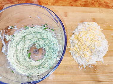 В сырную массу добавьте тертые яйца и перемешайте. Если масса на ваш вкус суховата, добавьте немного майонеза.