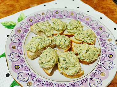 Намазка из плавленого сыра и яиц образец подачи закуски на стол по-быстрому. Здесь присутствует зелень, которая придаёт намазке цвет и свежесть.