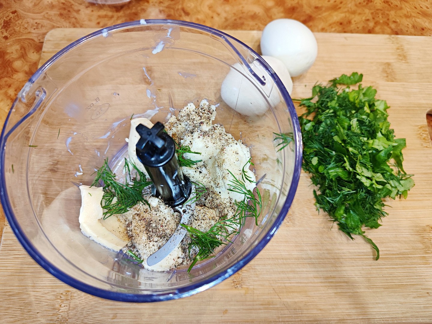 В чаше блендера соедините плавленые сырки, петрушку, укроп, соль и перец и взбейте. Степень однородности может быть любой от кремоообразной до мелких кусочков. Плавленые сырки неохотно взбиваются до кремообразного состояния. Для большей однородности массы можно добавить немного майонеза. Меня же устраивают мелкие кусочки, все равно по мере перемешивания с яйцами они сгладятся.