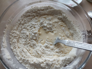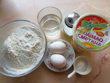Затем постепенно, частями, добавляем просеянную муку с разрыхлителем в емкость с яйцами, сметаной и водой. Начинаем тщательно вымешивать тесто, лучше всего руками. Как только тесто станет густым, лучше всего его перенести на ровную поверхность (стол или разделочную доску).