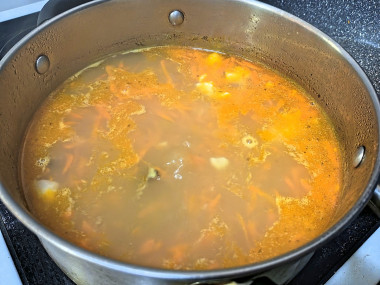 Бульон получился супер-наваристый из-за того, что обжаривались не только морковь, но и мясо. Правда, я взяла не филе, а окорочок. Часть мяса жарила, часть осталась на кости и варилась)