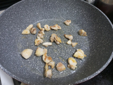 1. Куриное филе вымыть, обсушить и нарезать средними кусочками, посолить, поперчить. Обжарить курицу на растительном масле в течение 10 минут до образования легкого золотистого цвета.