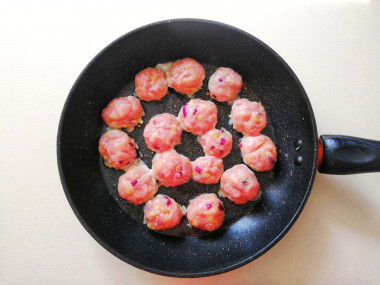 На сковороде разогрейте сливочное и растительное масло вместе. Выложите на него приготовленные фрикадельки.