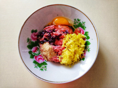 Готовятся они просто. Я делала на 2 порции. Добавила в свиной фарш яйцо, панировочные сухари, натертую на тёрке вареную картошинку, сливочное масло, молоко, соль и предварительно обжаренный лук (у меня был красный лук). Перец добавлять не стала.