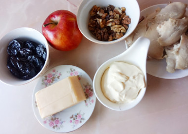 Калорийность продуктов: Куриное филе, Чернослив, Твёрдый сыр, Грецкие орехи, Яйца, Яблоки, Майонез