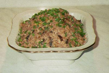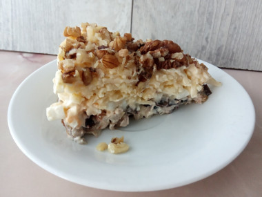 Как формировать салат? Установите на плоскую тарелку кулинарное кольцо (диаметром около 18 см). Первым слоем выложите филе, смажьте его майонезом. Вторым слоем равномерно распределите чернослив. Снова майонез. Далее яйца и майонез. Яблоко – майонез. Сыр – майонез. Сверху посыпьте салат рублеными орехами. Майонез можно переложить в кулинарный мешок и наносить майонезную сеточку на каждый слой.