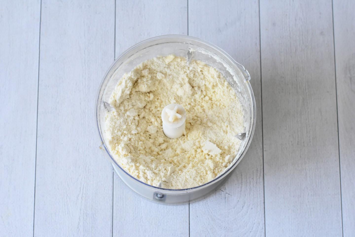 В чаше блендера соедините просеянную муку, нарезанное кубиками холодное сливочное масло и соль. Взбейте все в мелкую крошку. Если у вас нет блендера, можете перетереть мучную смесь в крошку руками.