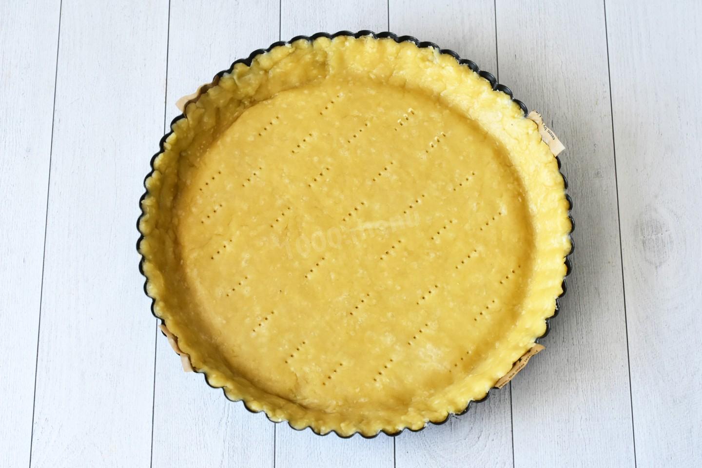 Охлажденное тесто раскатайте, выложите в застеленную пергаментом форму для выпечки (Ø 24 см) и сделайте бортики. Наколите тесто вилкой. На тесто выложите пергамент и насыпьте груз (горох, фасоль). Выпекайте основу около 20 минут в предварительно разогретой до 180℃ духовке. Основу охладите, груз уберите.