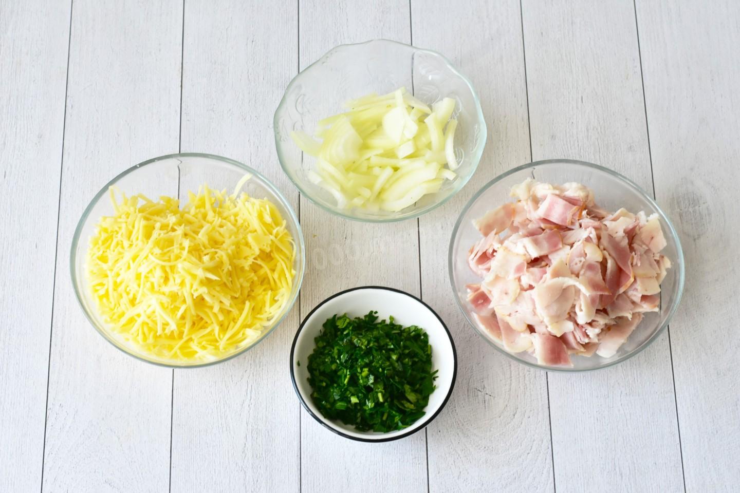 Бекон нарежьте небольшими кусочками. Сыр натрите на крупной терке. Лук нарежьте полукольцами или четвертькольцами. Петрушку вымойте, обсушите и мелко порубите. Петрушку можете заменить на зеленый лук.
