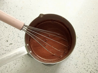 Затем добавляем 1 ст. ложку сахара и 2 ст. ложки какао. Перемешиваем. Ставим на медленный огонь. Нагреваем смесь, постоянно помешивая. Кипятить не стоит. Нагреваем до того момента, когда желатин растворится.