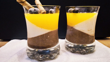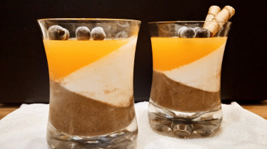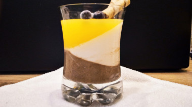 Заинтересовал рецепт, раньше не делала желе слоями, решила попробовать. Сразу скажу, спасибо автору, что предупредил о том, что первый кофейный слой расслаивается при застывании. Приготовила первый слой, поставила в холодильник и ушла из дома на час. Когда вернулась, увидела, что какао начало отделяться от молока. Вытащила, стала аккуратно перемешивать уже довольно густую смесь. Так как я хотела сделать необычные, неровные слои, аккуратно не получилось, как ни старалась. Это видно на фотографиях. Но на вкус это никак не отразилось, в следующий раз буду внимательно следить за слоями и не уходить надолго. Второй слой сделала молочный, а третий слой сделала из свежевыжатого апельсинового сока. Поставила соковыжималку на режим «без мякоти» и дополнительно процедила через ситечко. Сахара в апельсиновый сок не добавляла. Первые слои сладкие, а цитрус очень кстати нивелирует эту сладость.