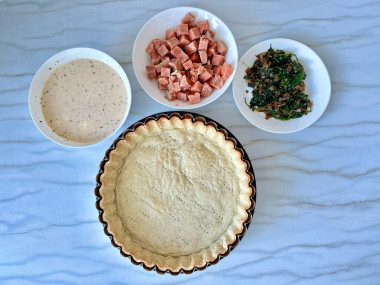 Тесто для этого пирога можно приготовить заранее самостоятельно или же воспользоваться магазинным вариантом. Если тесто было заморожено, его нужно достать заранее из морозилки, чтобы оно успело разморозиться и стать комнатной температуры. После его раскатываем, выкладываем в форму для выпечки так, чтобы получились бортики. Если это необходимо, краешки теста обрезаем. Накалываем тесто вилкой раз десять по дну и ставим форму с ним в холодильник на 15 минут.