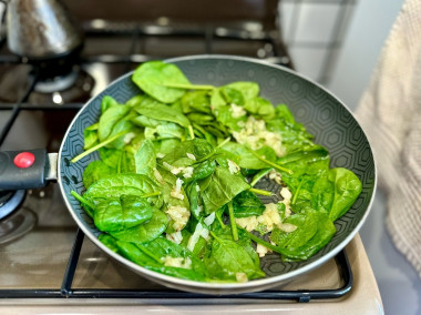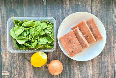 Далее всё делала по рецепту, за рыбную основу взяла горбушу в брикетах. Только полностью не размораживала, чтобы было удобно порезать на кусочки. От себя в конце пассировки шпината добавила чайную ложку сока лимона.