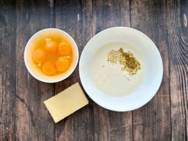 В отдельной миске смешиваем яйца, сливки и молоко, добавляем к смеси тертый мускатный орех (обязательно свежий, так как аромат быстро выветривается) и специи для рыбы (по желанию, без них тоже будет вкусно), солим. Аккуратно заливаем полученной смесью рыбу.