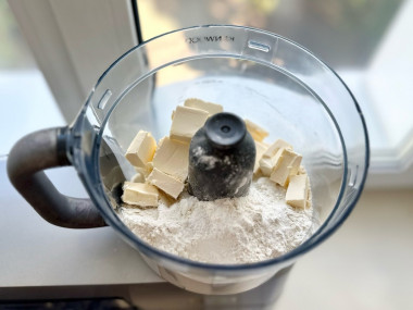 В блендере сделать крошку из муки, масла, соли и сахара.