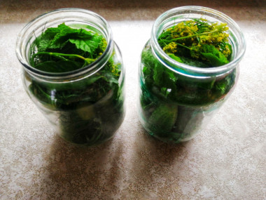 Сверху плотно уложите огурцы. В чайнике или кастрюле вскипятите воду. Залейте ей содержимое банок, чтобы она доходила до их плечиков. Оставьте банки на 15 минут, накройте их сверху крышками.