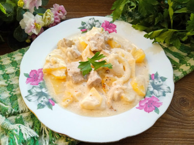Прекрасный рецепт! Получилась нежная картошечка с мягким луком и сочным мясом в майонезом соусе. Соуса предостаточно вышло. Очень ароматное и аппетитное блюдо. Особенно процесс приготовления понравился. Раз, два и готово. Классно, когда не нужно стоять возле плиты. Вкусно, сытно и много. Обязательно повторю это блюдо, уж больно юшечка понравилась))) И всем советую попробовать! Большое спасибо автору!
