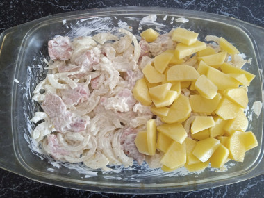 В форму для запекания, смазанную растительным маслом, выложите маринованное мясо с луком.