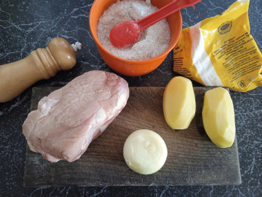 Как запечь свинину с картошкой в духовке с майонезом? Подготовьте продукты по списку. Вместо свинины можете взять другое мясо, только учитывайте, что калорийность и время готовки блюда изменятся.