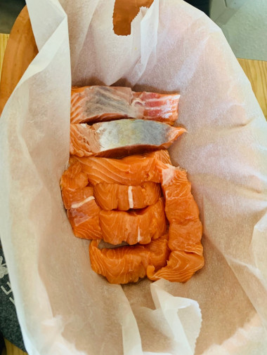 Застелите жаропрочную форму промасленной пергаментной бумагой. Выложите на неё рыбные ломтики.