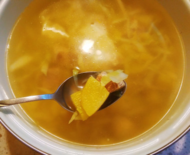 Выложите капусту и картофель в кастрюлю с кипящим бульоном и оставьте вариться минут на 15.