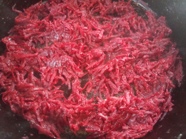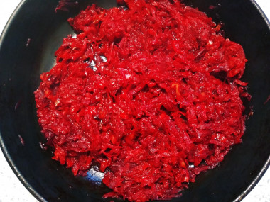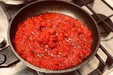 Отдельно обжарьте свеклу, натертую на терке. Добавьте к ней немного томатной пасты. Она придаст борщу небольшую кислинку и насыщенный цвет. На жарку свеклы уйдет еще минут 5-7. За время жарки она немного уменьшится в размере.