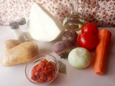 Калорийность продуктов: Картошка, Капуста, Лавровый лист, Соль, Специи сухие, Свинина, Вода, Лук, Помидоры, Свекла, Морковь, Растительное масло, Томатная паста