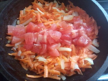 На сковороде разогрейте масло и обжарьте на нём лук и морковь в течение 4-5 минут на небольшом огне. Затем добавьте в зажарку нарезанные помидоры. Обжаривайте все вместе еще 3-4 минуты. За это время помидоры пустят сок и станут мягкие.