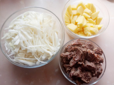 Капусту нашинкуйте, а картофель нарежьте на кусочки.