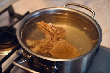Свинину можно использовать любую часть. Но если варить свинину на кости, то бульон будет получаться более наваристый. Поместите свинину в холодную воду, доведите до кипения и варите 1-1,5 часа. При закипании снимайте пенку, которая будет появляться. Готовый бульон процедите. Мясо нарежьте на кусочки и верните в кастрюлю.