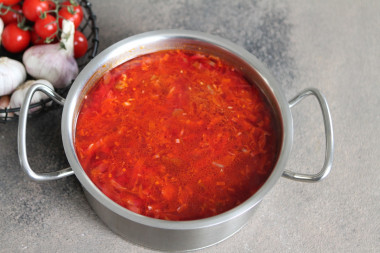 В последнее время варю борщ приблизительно так же,только вареную свеклу отдельно обжариваю с томатной пастой +сахар+соль.Морковь с луком обжариваю отдельно с одним свежим помидорчиком.Эту обжарку добавляю к картошке с капустой и варю все вместе до их готовности,а в свеклу добавляю давленный чеснок,перемешиваю и выключаю.Варю в мультиварке свой борщ.Он у меня бордового цвета и вкусный.