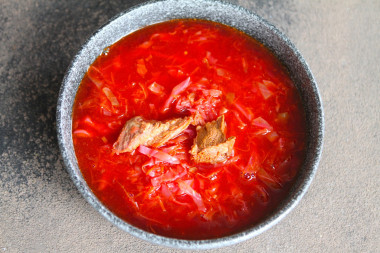 Люблю варить борщ, мне кажется, этот суп как полотно художника. В нем столько ярких красок и вкусов, такое разнообразие ингредиентов! Этот борщ варила тоже на свинине, только нарезала ее сразу на порционные кусочки. Я не уследила за бульоном и он закипел, пена свернулась. Чтобы исправить эту ошибку я доварила мясо до готовности, затем вынула его, а бульон процедила и перелила в другую кастрюлю. Затем снова вскипятила бульон с мясом. Далее добавляла овощи по рецепту. Бульон, кстати, стал прозрачным, без примесей, как я и люблю) В последнее время мне понравилось делать наваристую зажарку. А по этому рецепту ее можно есть как второе блюдо, она такая вкусная) Свеклу я взяла большую, чтобы цвет был насыщенный. От себя еще добавила чайную ложку сахара и большую ложку аджики. Борщ очень вкусный! А еще он красивый, сытный, наваристый! Мне тоже больше нравится борщ на второй день, он становится более насыщенным. Я подавала его с тыквенным хлебом и аджикой.