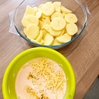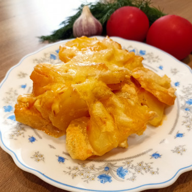 Пробовала похожий рецепт - картошка в сметане с сыром в духовке.