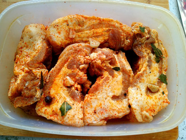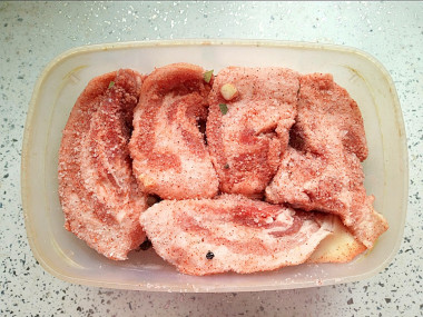 Теперь в подготовленной соляной смеси со всех сторон обваляйте нарезанные куски свинины. Поставьте поверх мяса гнет и уберите его в прохладное место на три дня для засолки.